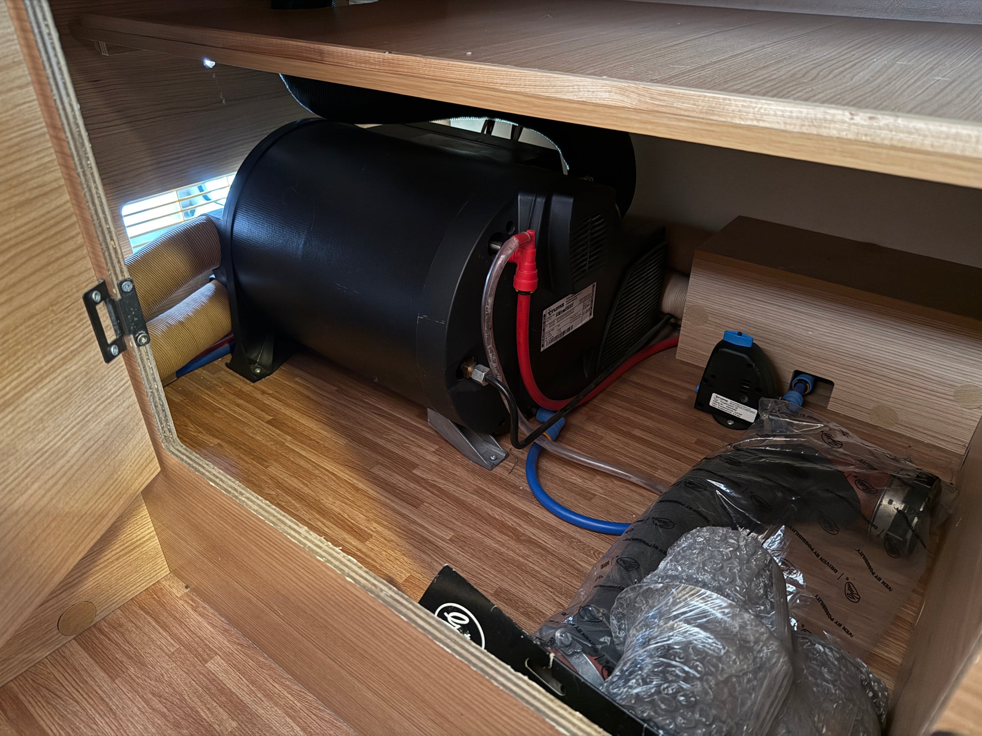 TrumaCombi, která zajišťuje topení a ohřev vody na LPG