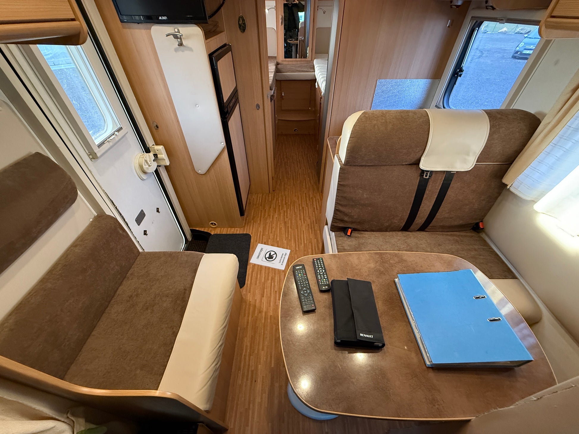 Lavice a jídelní stůl, které tvoří obytný prostor a dají se rozložit na spaní pro 1 osobu