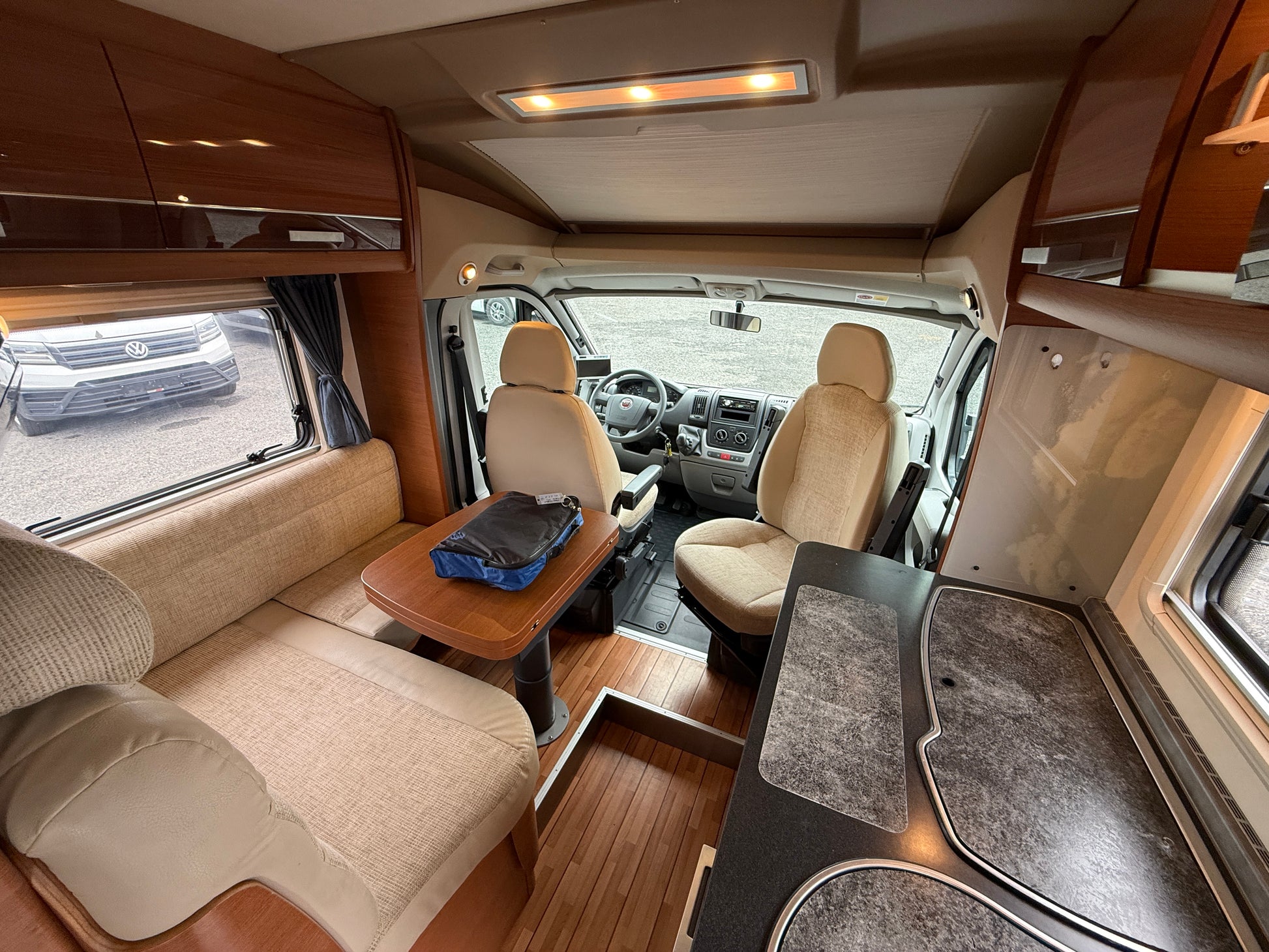 Lavice a jídelní stůl, které tvoří obytný prostor a lze rozložit na spaní