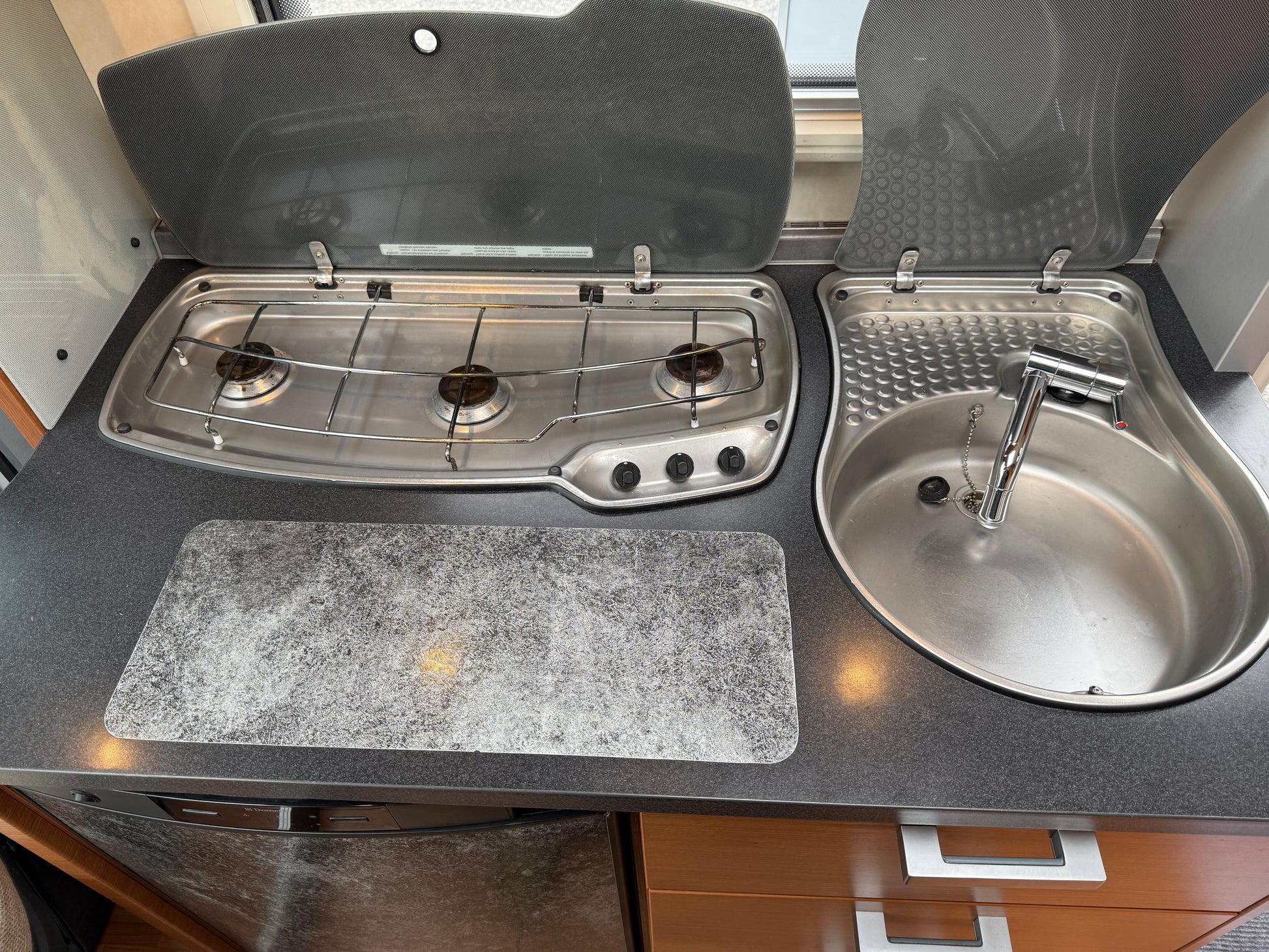 Dřez se sklopnou baterií a zakrývací deskou