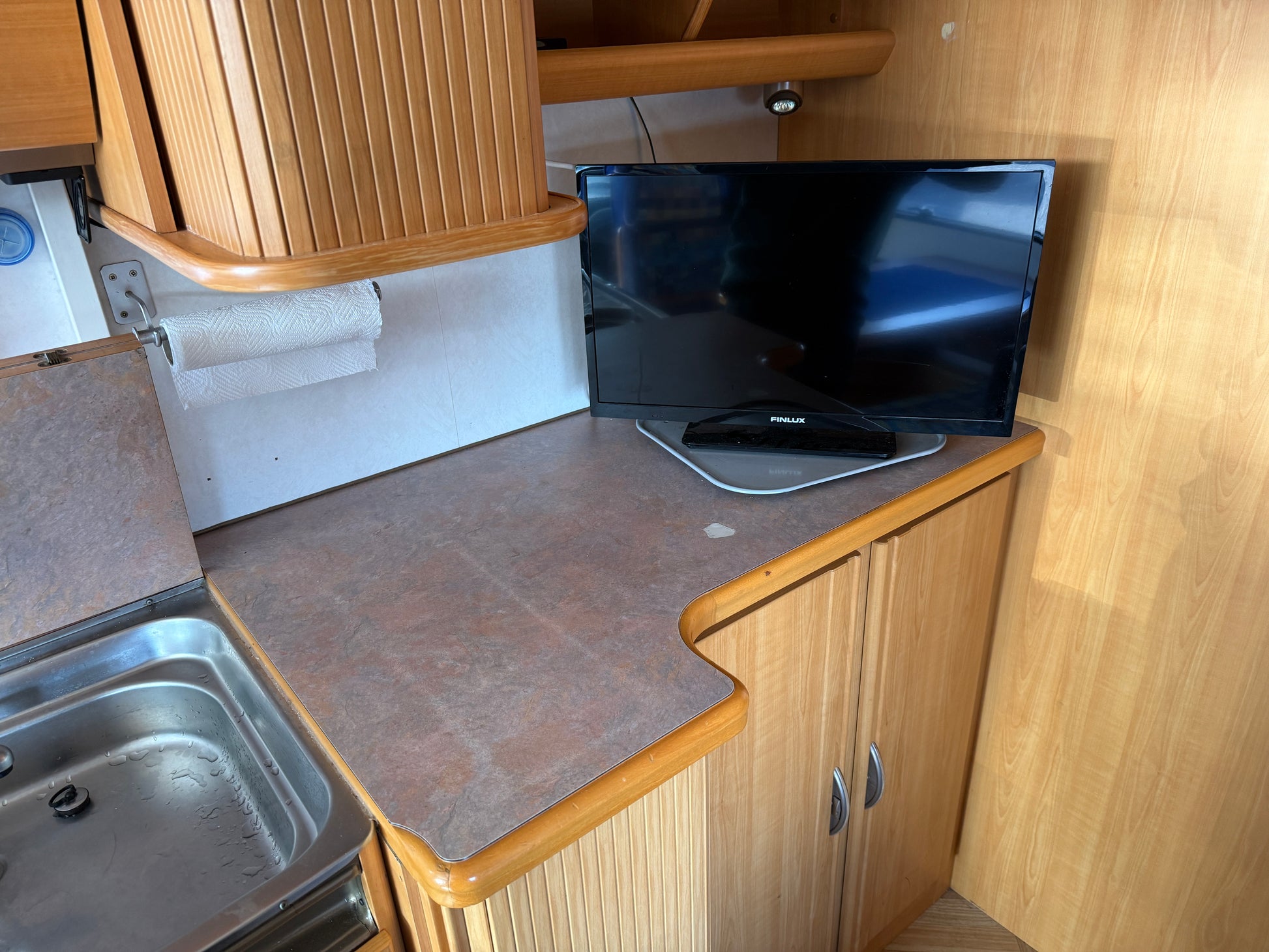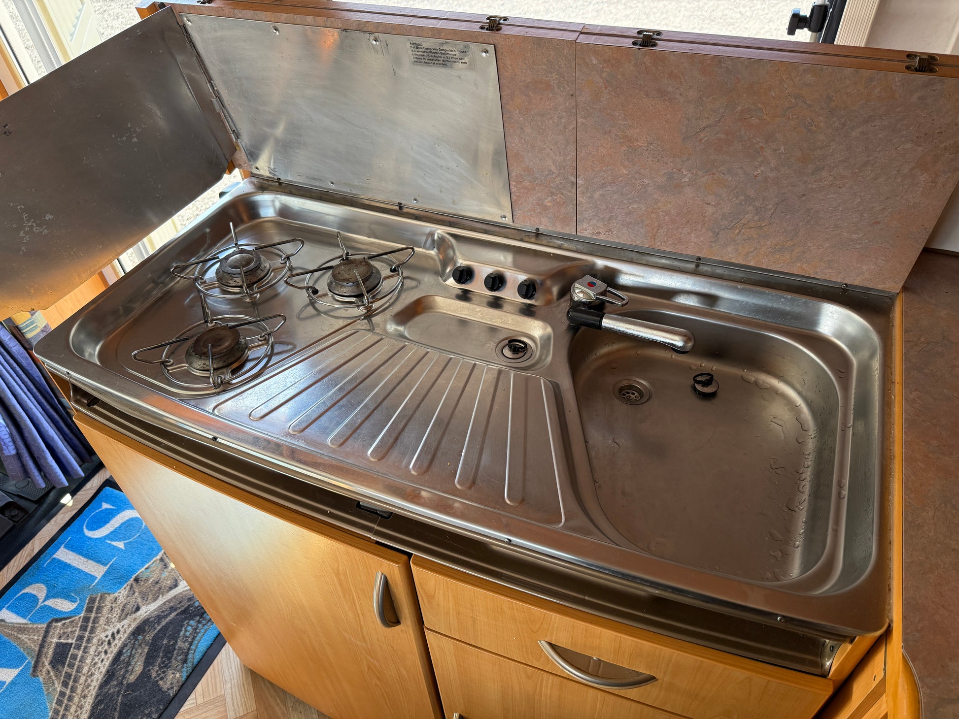 Dřez se sklopnou baterií a zakrývací deskou